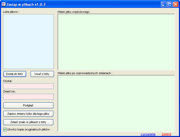 Program służy do wyszukiwania i zamiany tekstu w wybranych plikach.