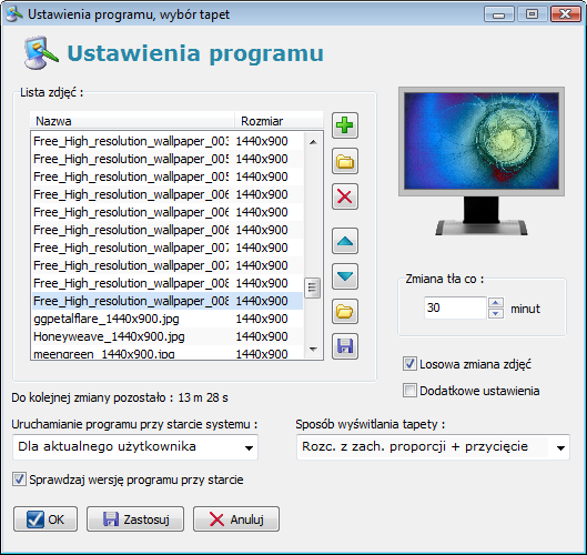 Zmiana tła co : ustawiamy czas po którym tapeta ma zostać zmieniona, oraz czy program ma losowo wybierać tapety z listy, jeżeli to pole zostanie nie zaznaczone, tapety będą zmieniać się według kolejności w jakiej są na